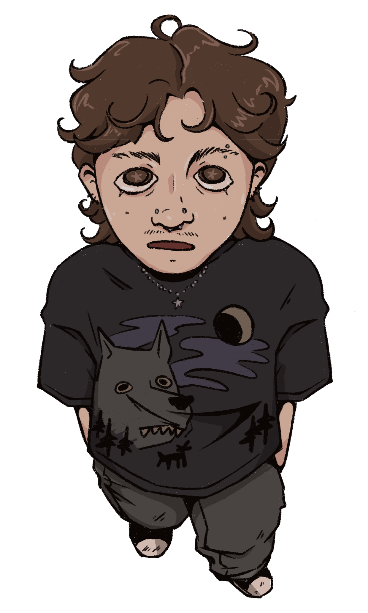 Aside from drawing cats, a lot of my work is inspired by personal experience. I'm interested in exploring themes of queerness, mental health, and disability through art and illustration. When I'm not drawing, I spend my time playing video games, watching horror movies, doing various crafts, and listening to music while wandering around my neighborhood.